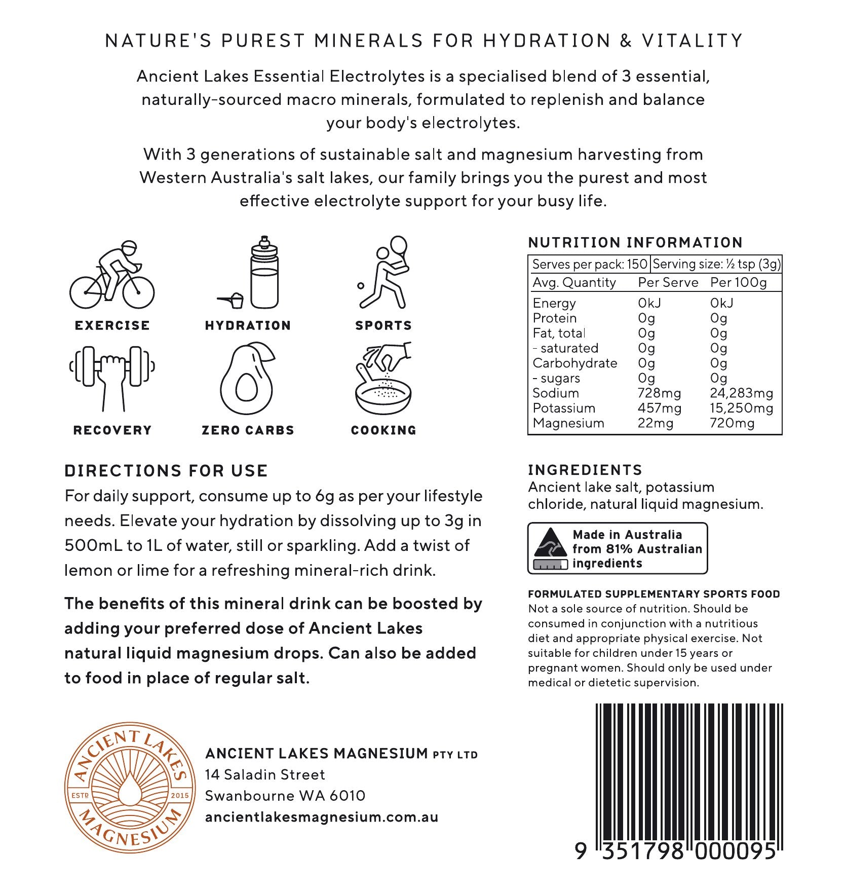 Ancient Lakes Mineral Balance Essential Electrolytes is a specialised blend of essential, naturally-derived macro minerals to help supplement and replace electrolytes.