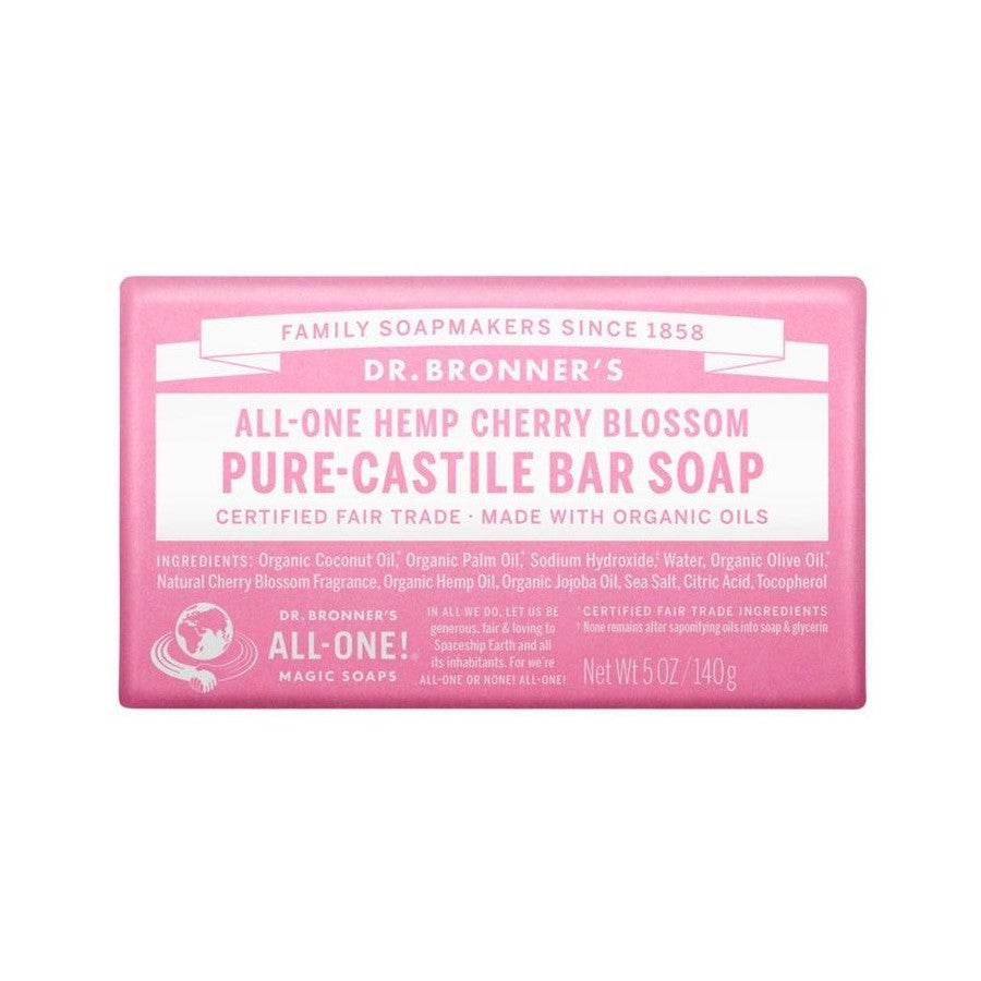 Sweet spring is in the air with our Cherry Blossom Pure-Castile Bar Soap. Dr. Bronner’s Bar Soap is made with certified fair trade ingredients and organic hemp oil for a soft, smooth lather that won’t dry your skin. 100% biodegradable in a 100% post-consumer recycled wrapper.